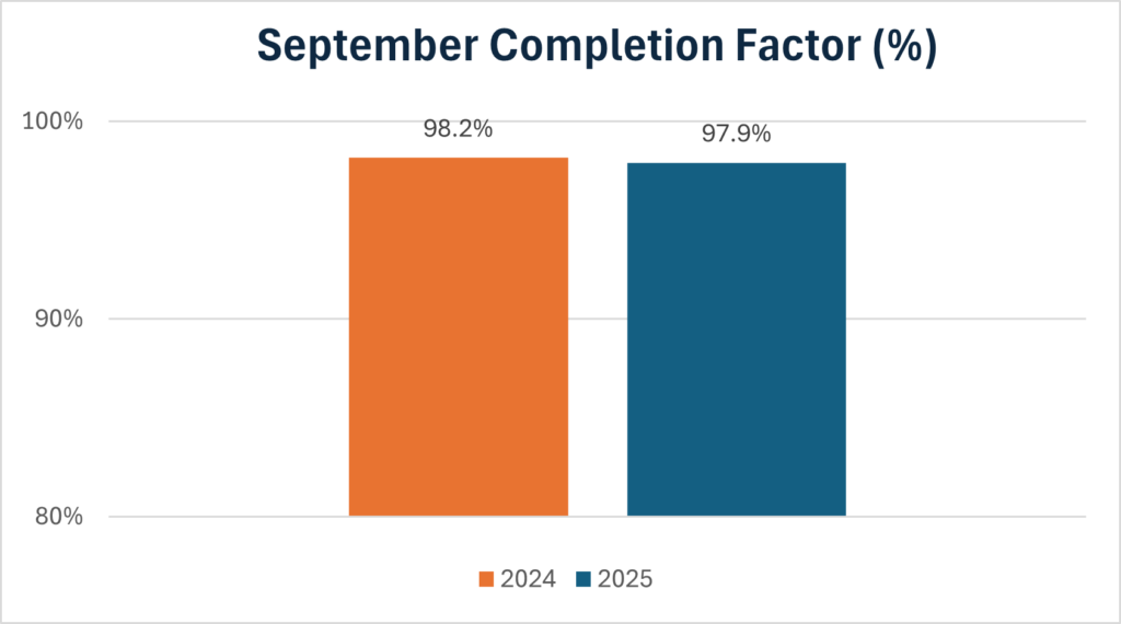 September sure welcomed us with patchy weather across BC, but our incredible crews and operations teams kept things running safely and smoothly! Thanks to their hard work, our Completion Factor (CF) held strong at 97.9%.