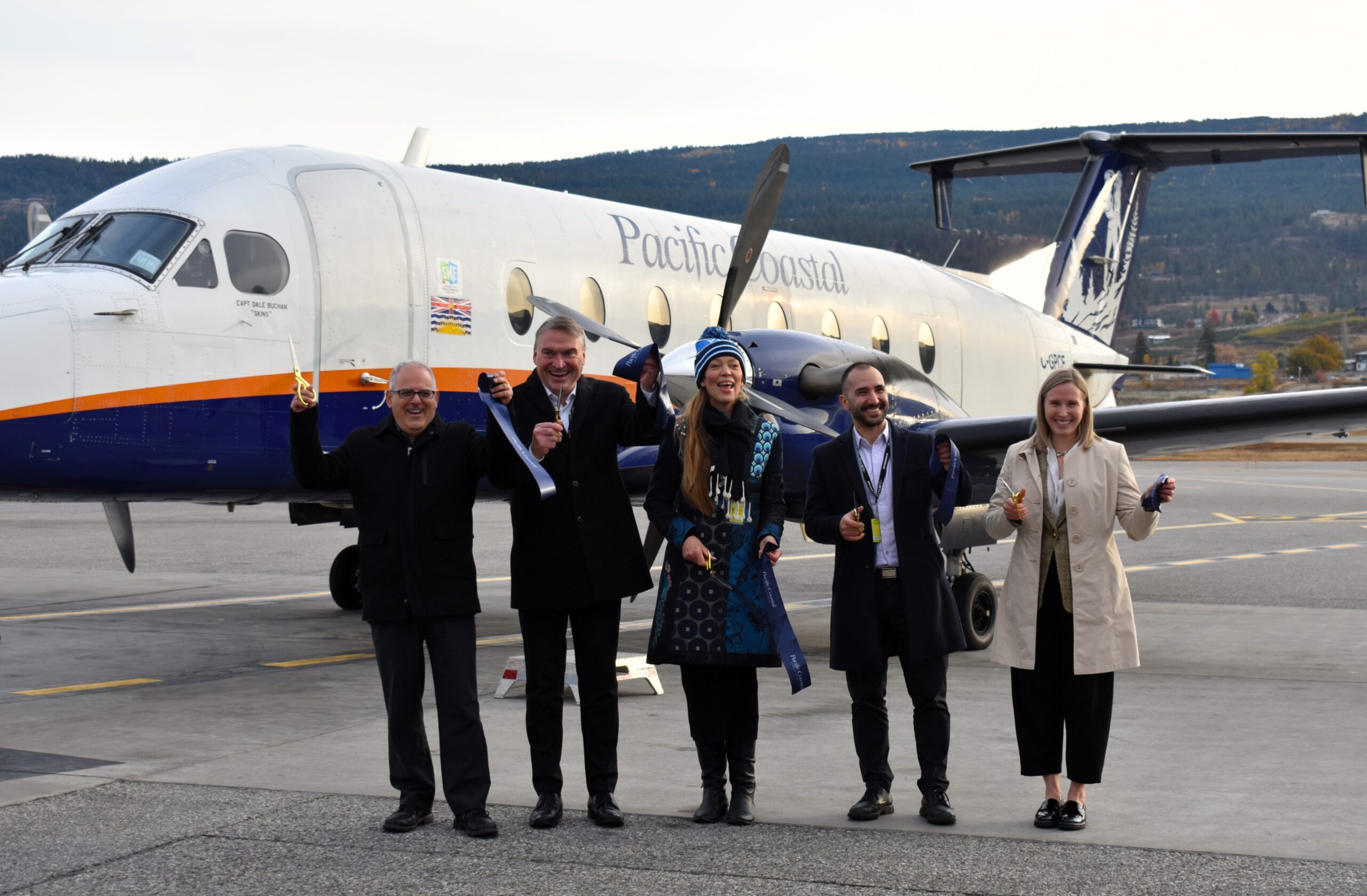 At Kelowna International Airport (YLW), attendees were welcomed with remarks from City of Kelowna Mayor Tom Dyas, Berkan Kucukkatipoglu, Pacific Coastal Airlines Director of Commercial Planning, Gemma Hamilton, YXC Financial Manager, and Phillip Elchitz, YLW Director of Operations & Innovation. A ceremonial ribbon-cutting marked the official start of operations, with commemorative gifts exchanged between the airports and Pacific Coastal to celebrate the milestone.